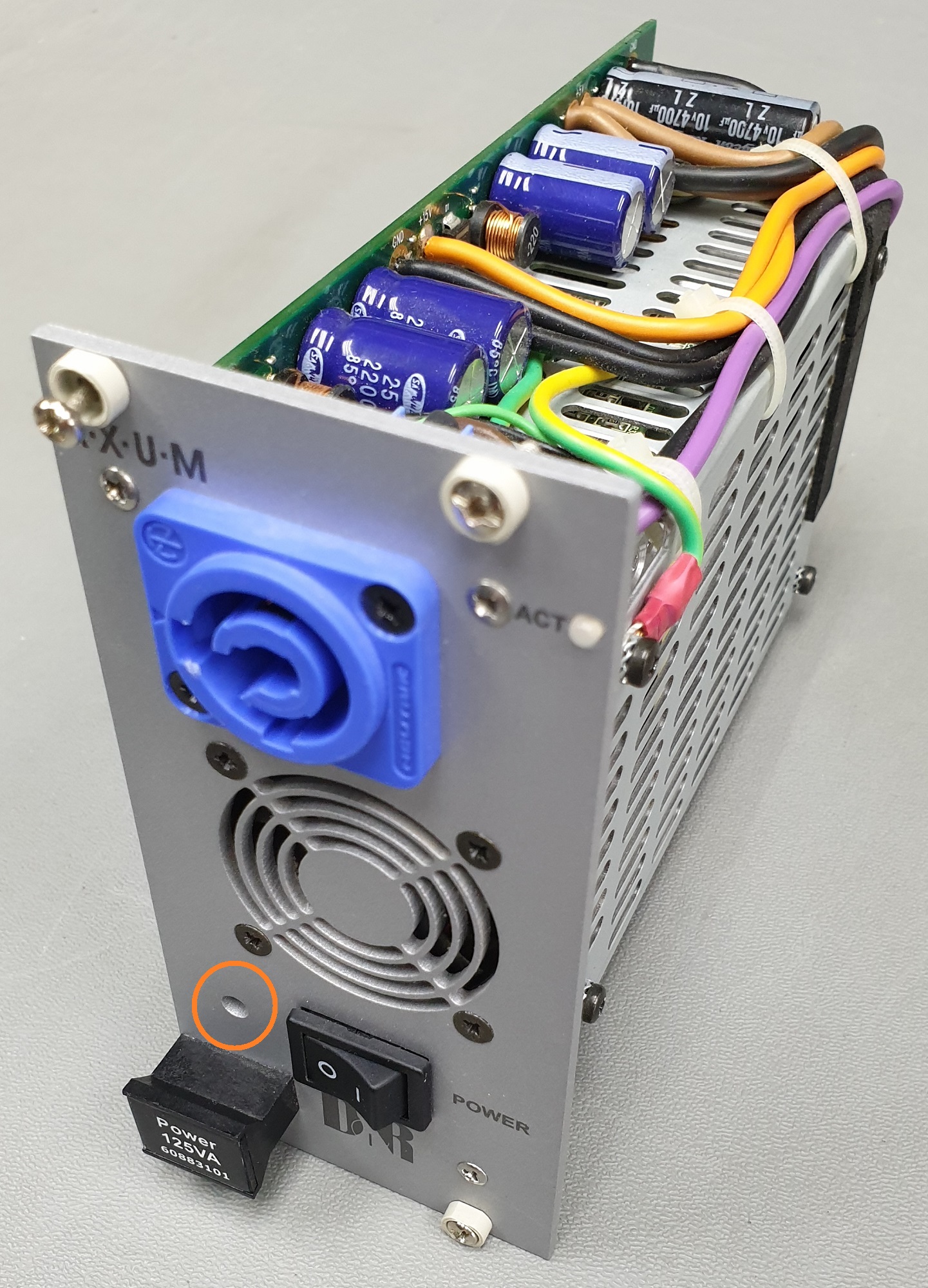 Now fine adjust the potentiometer at the front (Orange circle) until you measure 5.15 volts for a single power supply or 5.20 volts for a reduntant power supply.