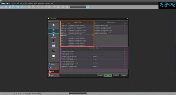 When you go to “Automation” (Red square) and then to “Extern audio Directsound” (Blue square) you can route an input and output (Purple square) for an external produced program.