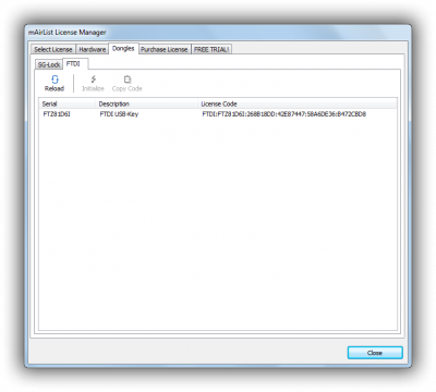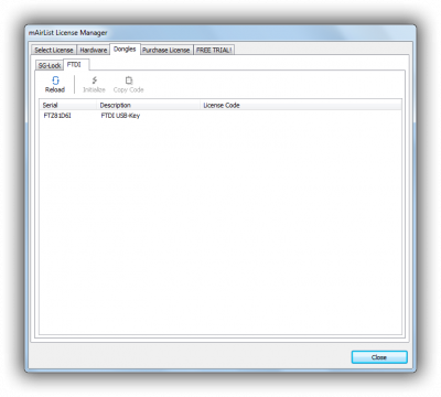 Then go to the Dongles → FTDI tab in the License Manager advanced view, and click Reload to scan your system for available FTDI devices. You will see a list of all attached devices along with their serial number and description:
