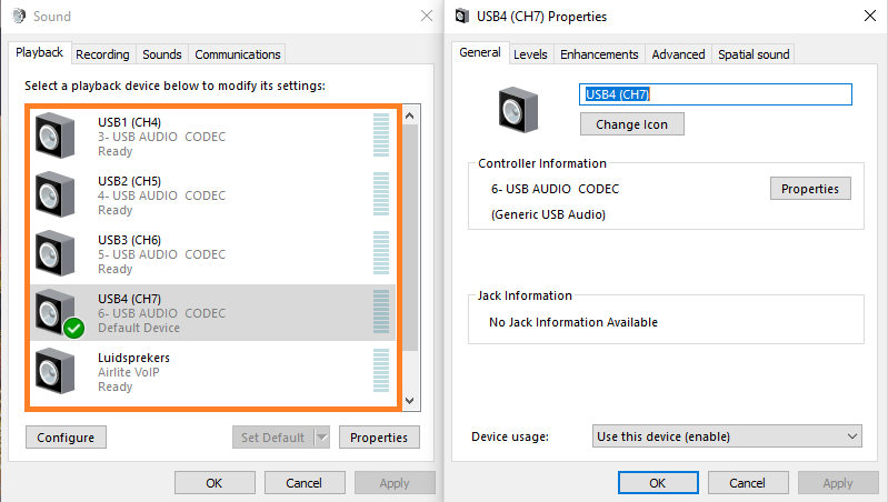 Here you see the Windows Sound settings with the corresponding outnputs highlighted with colors to easily recognize them.