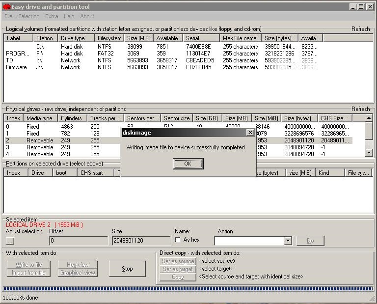 Then it will start to write the image to the selected partition, if you done everything right this will be the Compact Flash card.