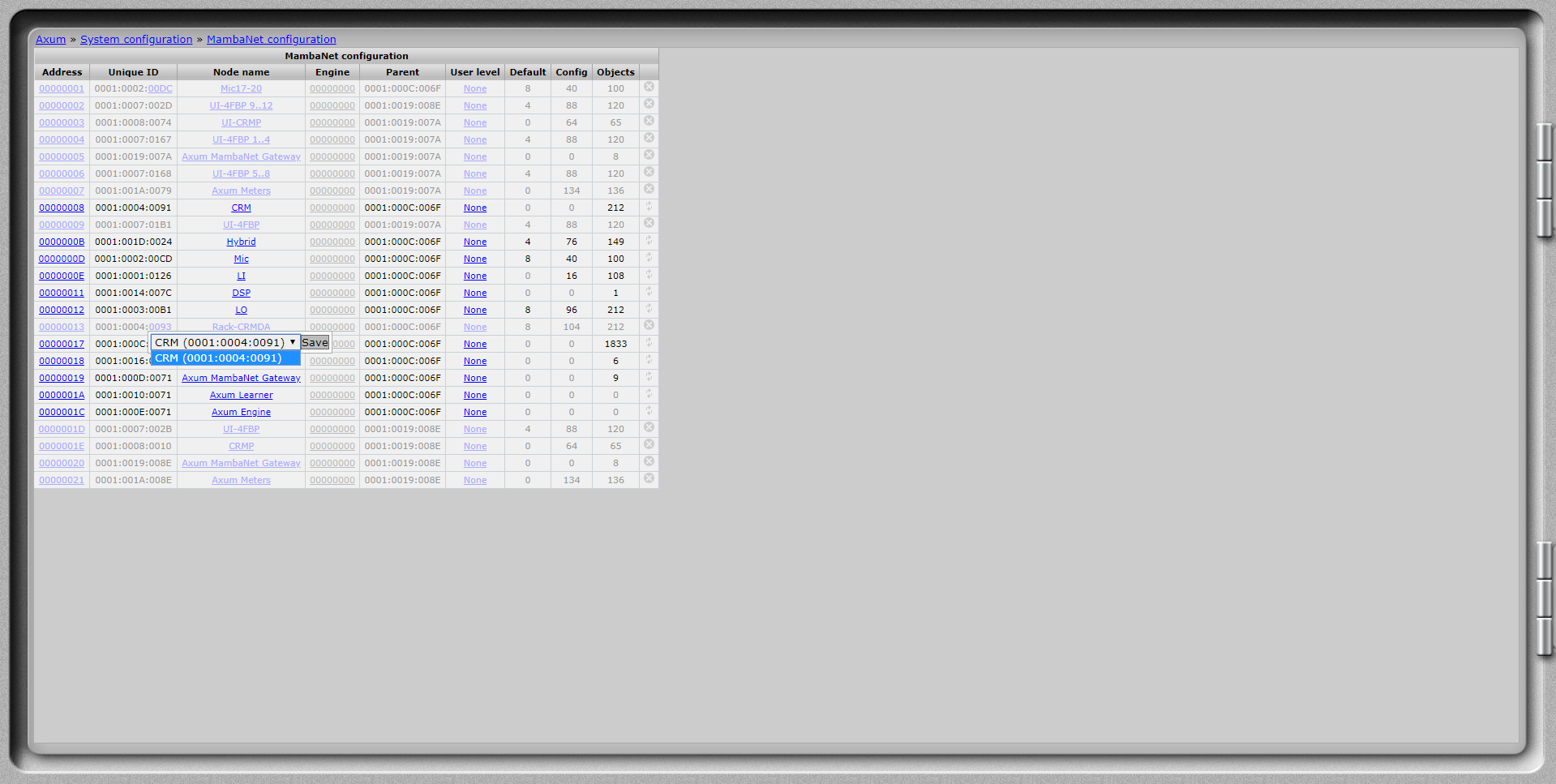 * Go to the webpage of the rack and navigate to: System Configuration → MambaNet Node Overview.