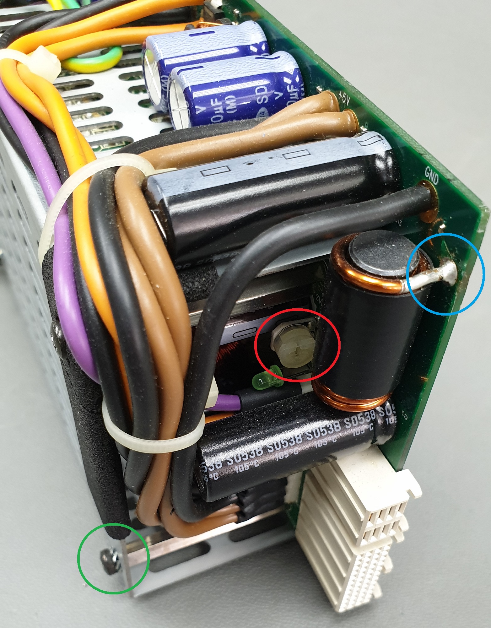 - Now fine adjust the potentiometer at the front (Orange circle) until you measure 5.15 volts for a single power supply or 5.20 volts for a reduntant power supply.