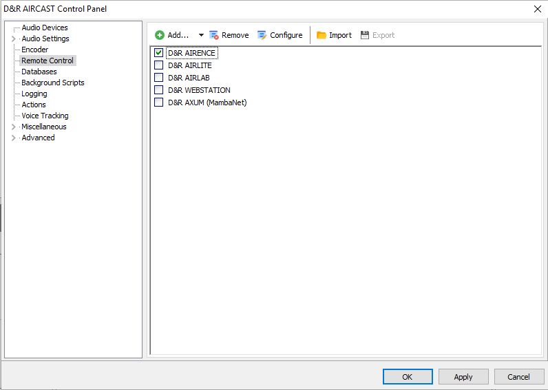 To control Aircast with you’re D&R mixer you’ll have to add the Remote Control function of the specific mixer.