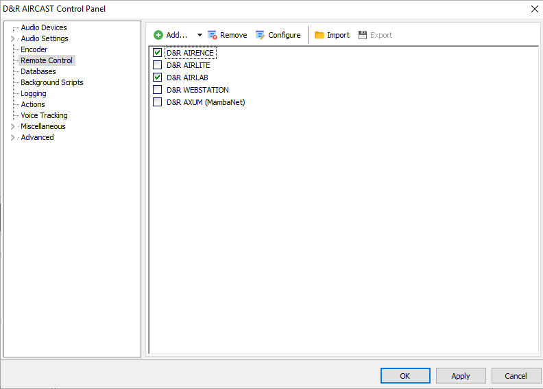 To control Aircast with you’re D&R mixer you’ll have to add the Remote Control function of the specific mixer.