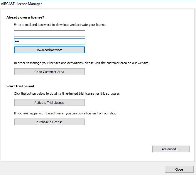 Now return to the license manager and Enter your e-mail address and password to download and activate your license.