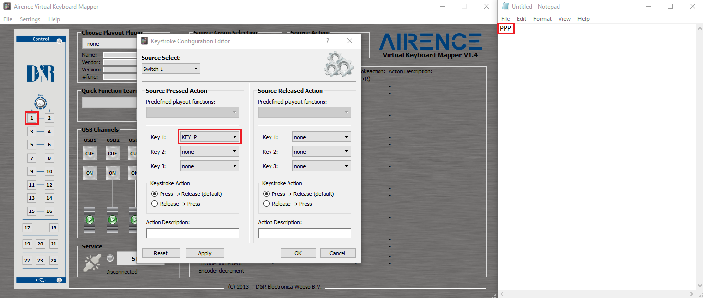 when a button on the Airence is programmed with a P in the keyboard mapper the computer receives a P after pressing and will work the same as your keyboard.