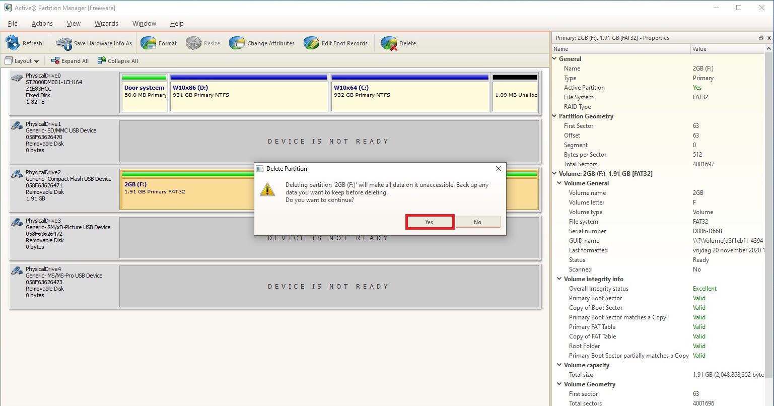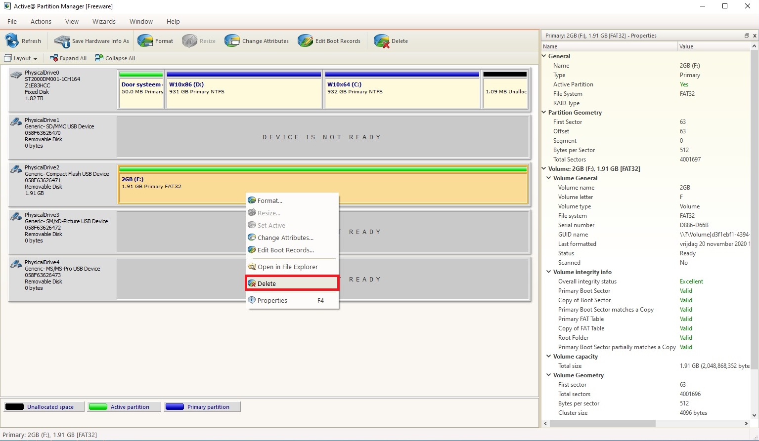 Now right click at the 2GB (1.91 GB compact flash card line and at the menu choose “Delete”.
