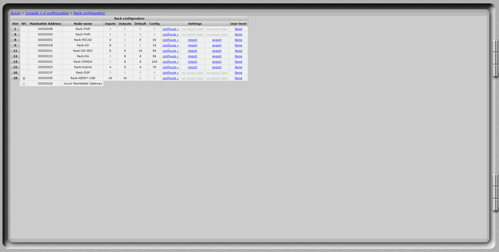 Because the "AES67/USB card" is developed recently it's settings aren't available for "Import" at the "Rack configuration".