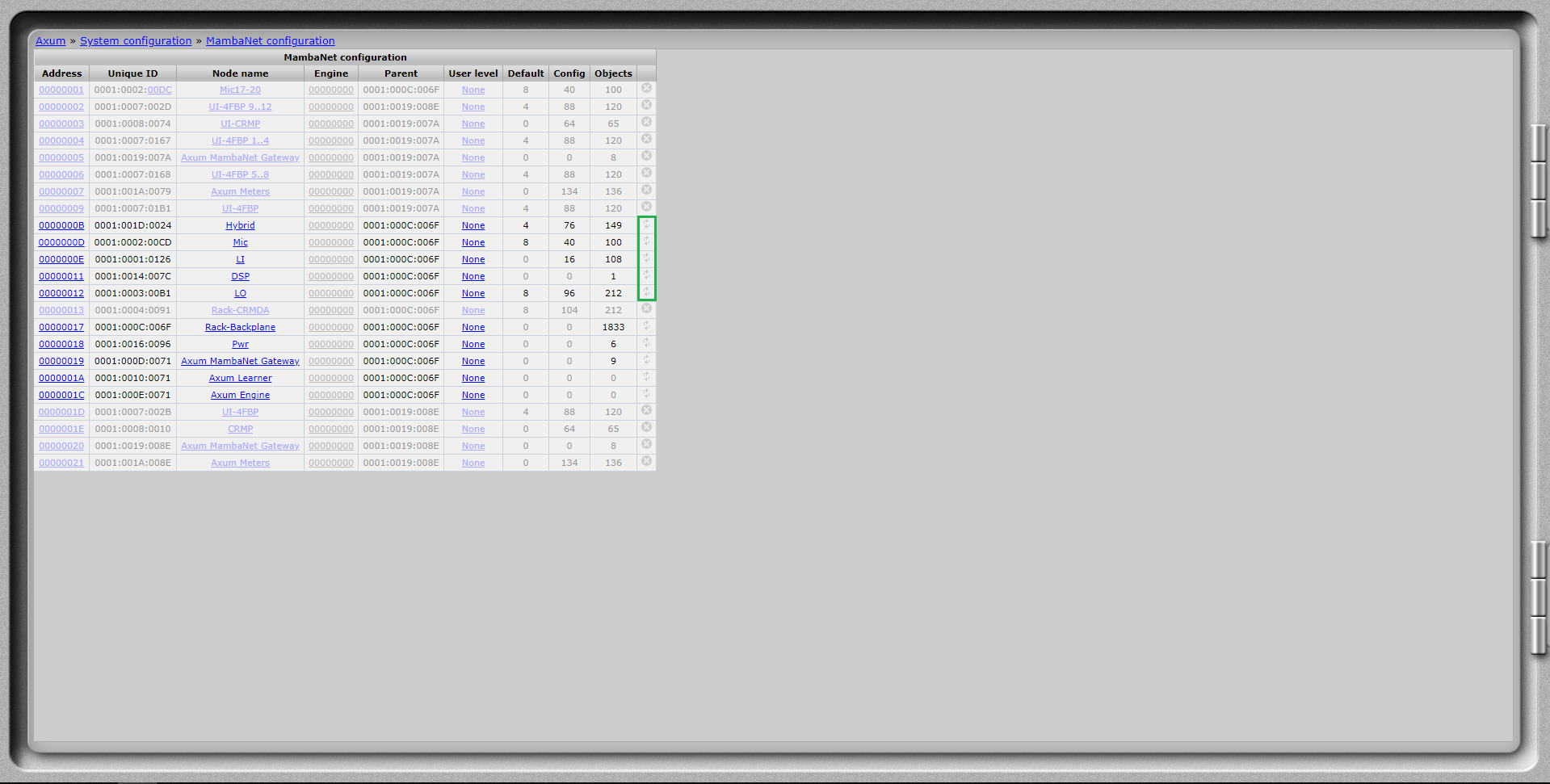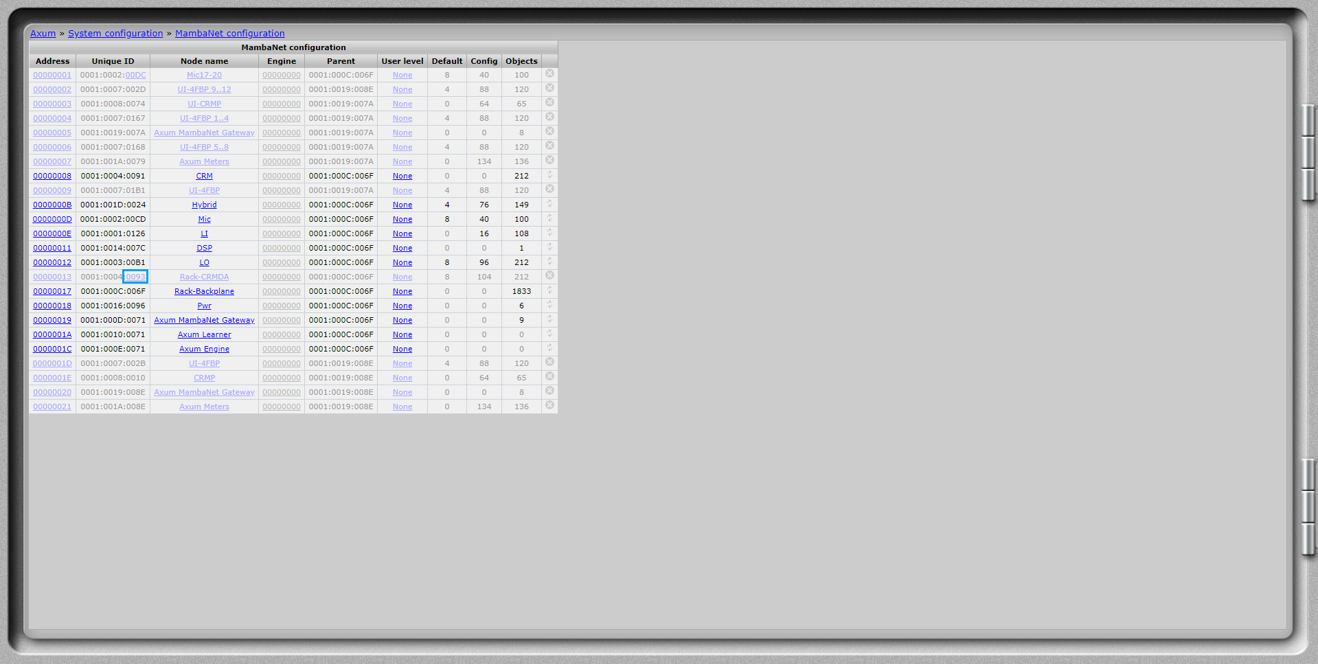 * Go to the webpage of the rack and navigate to: System Configuration → MambaNet Node Overview.