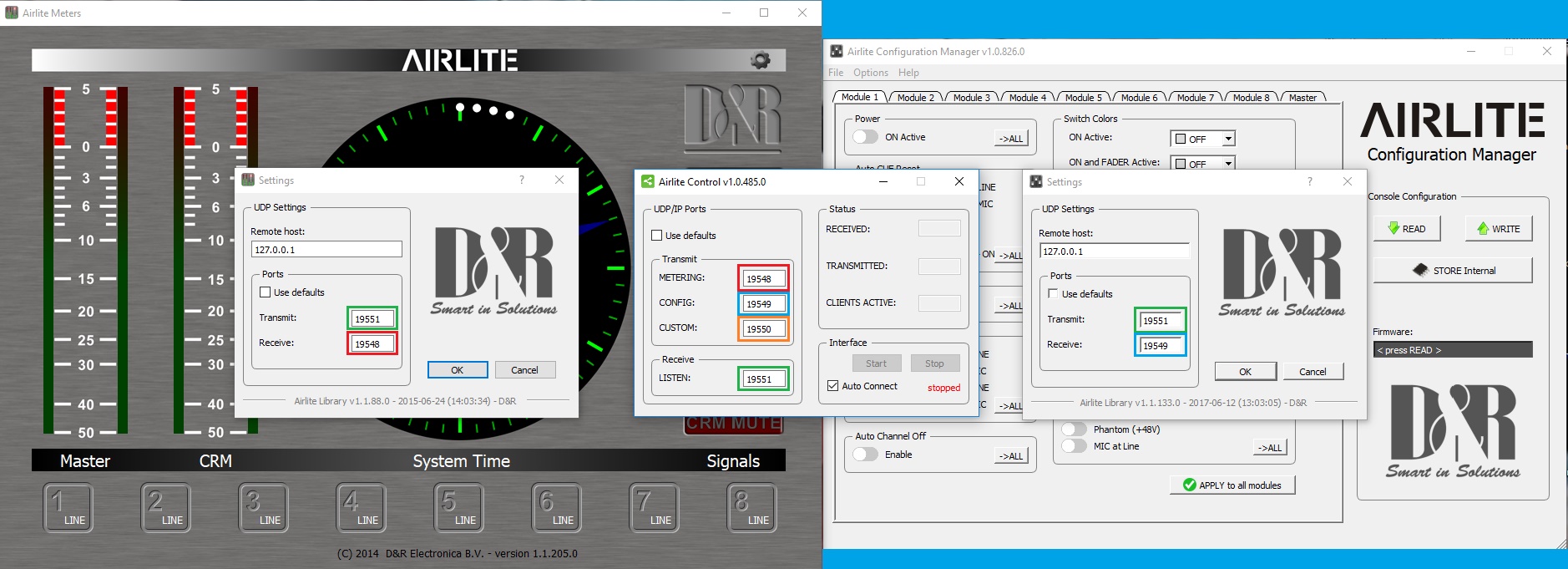 For transmitting the configuration to the Mixer the Green port is used (Software to mixer).